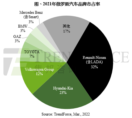 受俄乌抵触影响,现在于俄罗斯境内的轿车工厂皆连续罢工,并中止进口车辆,再加上俄罗斯表明若外资企业在此期间挑选永久歇业或退出商场,则会将其工作收为国有,因为大都品牌在当地设有工厂,现下面对世界形势与企业丢失的两层压力。据TrendForce集邦咨询查询,Renault-Nissan在收买俄罗斯品牌LADA后,市占率达32%,为当地最大品牌,其次为23%的Hyundai-Kia,以及12%的Volkswagen。