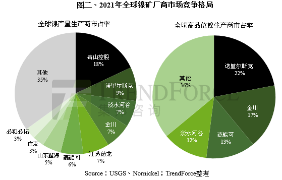 据TrendForce集邦咨询表明,镍作为电动车动力电池制作的上游要害质料,在动力电池中首要用于三元正极资料的制作,2021年全球镍矿产值约为270万金属吨,首要来自印度尼西亚、菲律宾和俄罗斯。其间俄罗斯镍矿产值占有全球总产值约9%(包括了低、中、高品位镍),位居第三名。