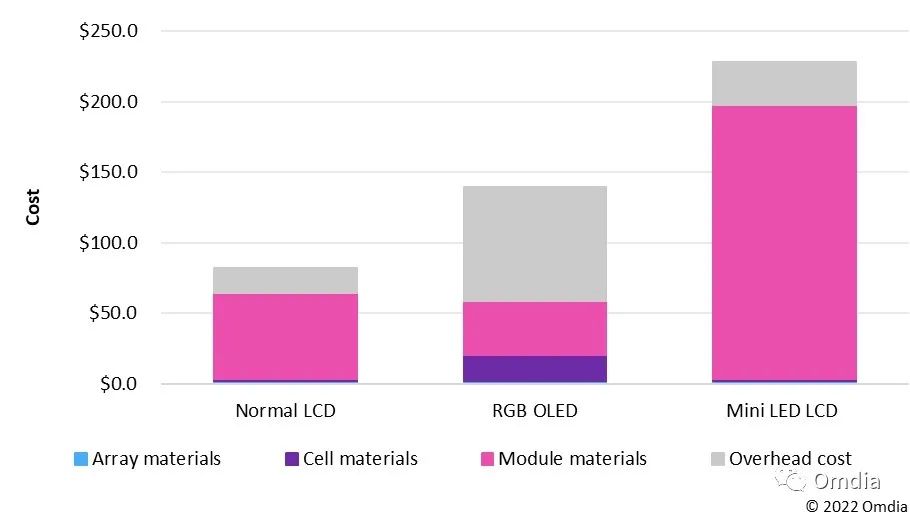 OLED面板的制作本钱基本上取决于其尺度。16.2英寸面板的面积比12.9英寸面板大50%,因而其制作本钱大幅添加。但是,关于mini LED背光LCD来说,状况就不同了。模组资料占有mini LED背光LCD总制作本钱的最大部分,但它与面板尺度不成正比。