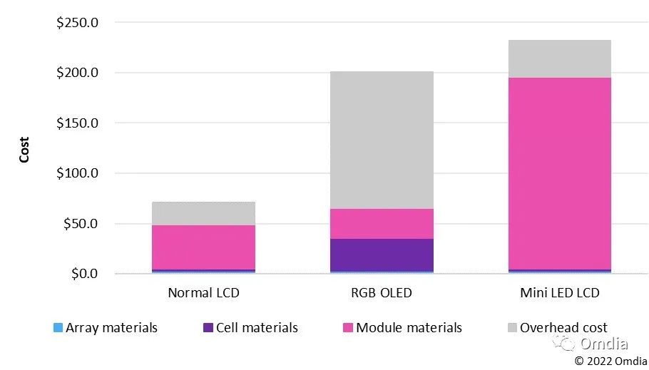 图1:LCD/OLED与Mini LED背光LCD本钱比较 ─ 12.9英寸2732×2048平板电脑