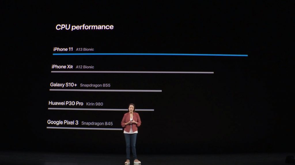 装备方面,iPhone 11 搭载 A13 Bionic 处理器,苹果还比照了各款手机的处理器功能,列出来的手机包括上一年推出的 iPhone XR——这或许也透露了 iPhone 11 确实对应了 iPhone XR。除了三星和 Google 的新款手机,你没看错,华为现在也是苹果的“友商”,华为 P30 Pro 搭载的麒麟 980 也在其间。