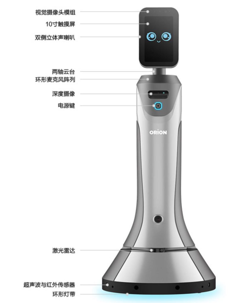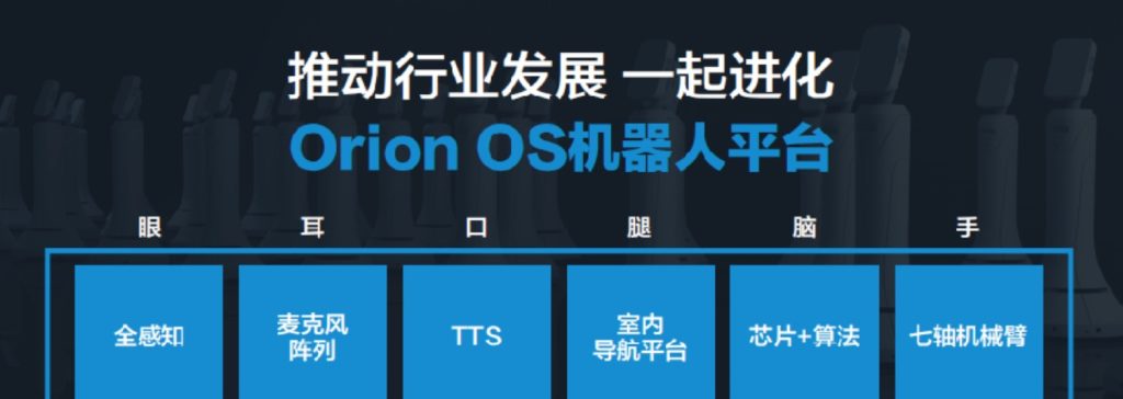 猎户机器人渠道 Orion OS 是猎豹移动联合旗下人工智能公司猎户星空自主研制的机器人渠道,调集了多芯片体系(猎户大脑),摄像机+视觉算法(眼),麦克风阵列(耳),猎户TTS(口),室内导航渠道(腿)和七轴机械臂(手)等完好技能链条。